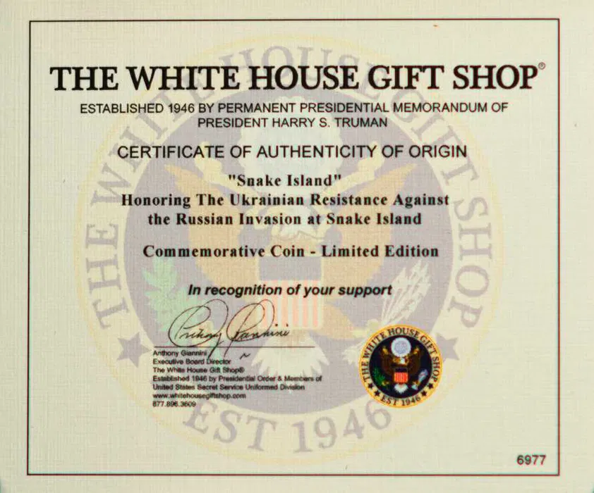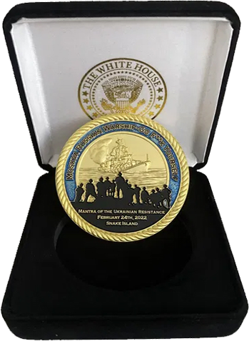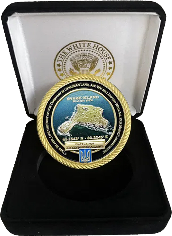 Купить на OLX Памятная коллекционная медаль, выпущенная ограниченной серией, посвящённая стойкости украинских защитников и эпизоду с островом Змеиный (Snake Island). На аверсе — рельефное изображение корабля и надпись «Mantra of the Ukrainian Resistance», дата 24 февраля 2022. На реверсе — топографический вид острова и координаты. Медаль поставляется в подарочной шкатулке с символикой.